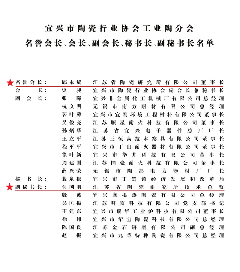 大會上,經(jīng)所有與會代表審議,一致鼓掌通過了“宜興市陶瓷行業(yè)協(xié)會工業(yè)陶分會工作條例”、"宜興市陶瓷行業(yè)協(xié)會工業(yè)陶分會理事單位名單"以及“宜興市陶瓷行業(yè)協(xié)會工業(yè)陶分會名譽會長、會長、副會長、秘書長、副秘書長名單”。