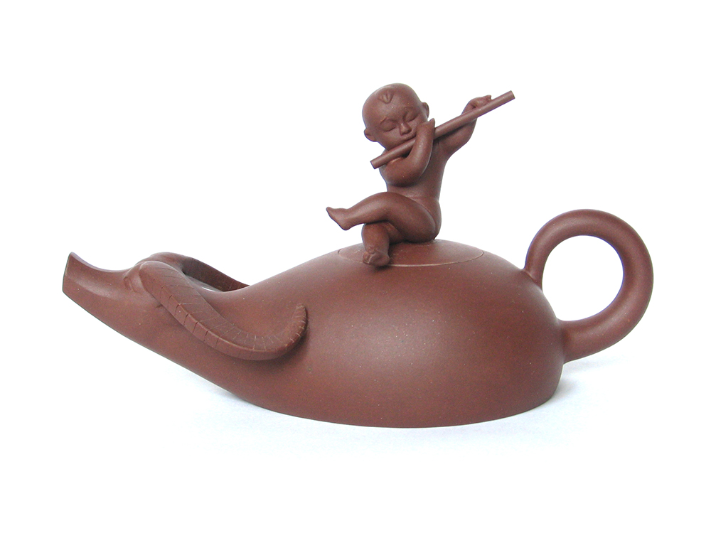 此作品將雕塑與壺的功能巧妙結(jié)合,小牧童坐在牛背上悠閑自得地吹著笛子,看似雕塑,實(shí)則茶壺,妙趣橫生,整個(gè)造型別致美觀。