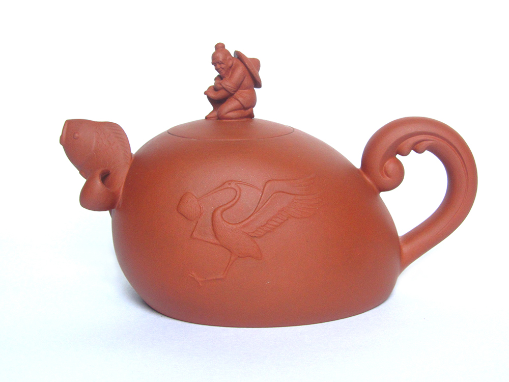 此作品巧妙的將一句成語(yǔ)(鷸蚌相爭(zhēng),漁翁得利)演變成壺的造型,充分表現(xiàn)了這句成語(yǔ)的深刻含義,整個(gè)造型將雕塑元素和茶壺元素溶為一體,相得益彰。